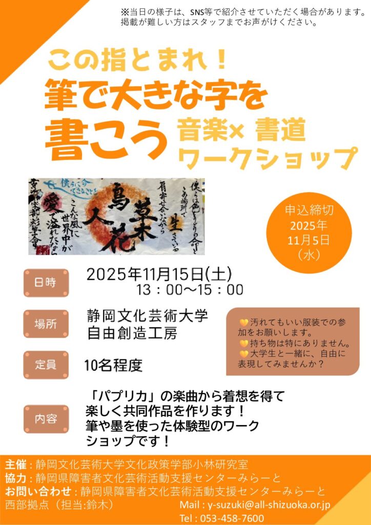 小林研究室では官学連携活動として、静岡県障害者芸術文化活動支援センター みらーと、と連携した活動を行っています。障害者アート活動はデザイン学部と文化政策学部を持つ本学の特徴を生かした活動であり、地域連携演習としても実施されています。本学学生が地域の福祉的課題の解決に貢献することを目指した「碧い翔け橋」となることを標榜した活動として毎年実施されています。